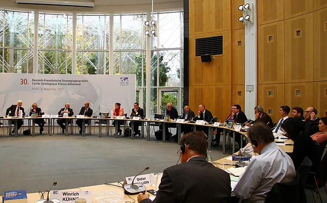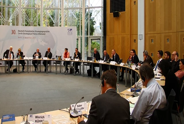 30. deutsch-französische Strategiegespräche 11/08/2017 23:00 to 01/01/1970 00:00 - Friedrich-Ebert-Stiftung Berlin Die deutsch-französischen Strategiegespräche sind ein Dialog-Forum, das gemeinsam mit dem IRIS organisiert wird und in dem unter Chatham-House-Regeln über aktuelle Herausforderungen in der Sicherheits- und Außenpolitik diskutiert wird. Parlamentarier und Experten tauschten sich beim 30. „Cercle“ über die Politik gegenüber Russland, die „Europäische Verteidigungsunion“ und die Situation in der MENA-Region aus. 30. deutsch-französische Strategiegespräche Berlin, 9. November 2017 Begrüßung Kurt Beck, Vorsitzender der Friedrich-Ebert-Stiftung, Ministerpräsident von Rheinland-Pfalz a.D. Die neue Weltordnung Gernot Erler, Co-Präsident des Cercle stratégique Eine neue Rußlandpolitik nach den Wahlen in Frankreich und Deutschland? Gernot Erler, Koordinator für die zwischengesellschaftliche Zusammenarbeit mit Russland, Zentralasien und den Ländern der östlichen Partnerschaft, Staatsminister a.D. Jean de Gliniasty, ehemaliger französischer Botschafter in Russland, Forschungsleiter am Institut de relations internationales et stratégiques (IRIS) Diskussion Moderation: Matthias Jobelius, Leiter des Referats Mittel- und Osteuropa der Friedrich-Ebert-Stiftung Der deutsch-französische Beirag zur "Europäischen Verteidigungsunion"Konvergenzen und Divergenzen Fritz Felgentreu, MdB, Mitglied des Verteidigungsausschusses Marie Recalde, ehem. Abgeordnete und Mitglied des Verteidigungsausschusses (Departement Gironde) Diskussion Moderation: Jean-Pierre Maulny, stellvertretender Leiter des IRIS Welche Prioritäten für die Krisenlösung in der MENA-Region? Niels Annen, MdB, Obmann im Auswärtigen Ausschuss Delphine O, Abgeordnete (Paris), Mitglied des Auswärtigen Ausschusses der Nationalversammlung, Vorsitzende der französisch-iranischen Freundschaftsgruppe Diskussion Moderation: Michèle Auga, Leiterin des Referats Westeuropa/Nordamerika und Japan der Friedrich-Ebert-Stiftung Gernot Erler, Kurt Beck, Roland Schmidt Matthias Jobelius, Jean de Gliniasty, Gernot Erler, Kurt Beck, Roland Schmidt Jean de Gliniasty, Marie Recalde, Jean-Pierre Maulny, Fritz Felgentreu Niels Annen, Michèle Auga, Delphine O