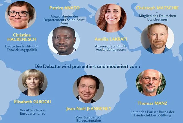 Eine neue Partnerschaft zwischen Afrika und der EU. Welchen Beitrag können Deutschland und Frankreich leisten? 11/08/2020 23:00 to 01/01/1970 00:00 - 15.30-17.30 Uhr, Online-Konferenz Onlinekonferenz in Zusammenarbeit mit Europartenaires mit Elisabeth Guigou, Vorsitzende von Europartenaires, Ministerin a.D., Christine Hackenesch, Deutsches Institut für Entwicklungspolitik (DIE), Patrice Anato, Abgeordneter des Departements Seine-Saint-Denis, Christoph Matschie, Mitglied des Deutschen Bundestages, Amélia Lakrafi, Abgeordnete der Auslandsfranzosen Anfang März hat die Europäische Union ihre neue Afrika-Strategie vorgestellt. Angesichts der geostrategischen Interessen Europas in Afrika soll sie ein Herzstück der Arbeit der neuen EU-Kommission werden. Im Zentrum der zukünftigen „neuen Art“ der Partnerschaft sollen Themen gemeinsamen Interesses stehen wie Klima und nachhaltiges Wachstum, aber auch Arbeitsfelder mit Konfliktpotential wie Migration und Sicherheit. Auf einem gemeinsamen Gipfel wollen EU und Afrikanische Union die Weichen hin zu der neuen Partnerschaft auf Augenhöhe stellen. Wie notwendig ist die neue EU-Afrika-Strategie? Ist ihre strategische Ausrichtung der beschworenen „neuen Art“ der Partnerschaft angemessen? Bedarf es angesichts der Corona-Krise Anpassungen an der Strategie? Wie wird die neue Afrika-Strategie in Deutschland und Frankreich bewertet? Welchen Beitrag können beide Länder gemeinsam zur Förderung einer neuen Partnerschaft leisten? Diesen Fragen wollen wir im Rahmen einer Online-Debatte nachgehen. 15.30h Begrüßung • Elisabeth Guigou, Vorsitzende von Europartenaires, Ministerin a.D. • Thomas Manz, Leiter des Pariser Büros der Friedrich-Ebert-Stiftung 15.45 -16.30h Panel 1: Eine neue Afrikastrategie der EU – warum und welche? • Christine Hackenesch, Deutsches Institut für Entwicklungspolitik (DIE) • Patrice Anato, Abgeordneter des Departements Seine-Saint-Denis Moderation : Jean-Noël Jeanneney, Vorsitzender von Europartenaires 16.30 – 17.15h Panel 2: Welchen Beitrag können Deutschland und Frankreich zu einer neuen Partnerschaft leisten? • Christoph Matschie, Mitglied des Deutschen Bundestages • Amélia Lakrafi, Abgeordnete der Auslandsfranzosen Moderation : Jean-Noël Jeanneney, Vorsitzender von Europartenaires 17.15 - 17.30h Schlussbemerkung Elisabeth Guigou, Vorsitzende von Europartenaires, Ministerin a.D. Deutsch-französische Simultanübersetzung
