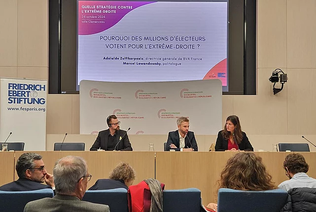 Parlamentarische Strategien gegen die extreme Rechte 10/23/2024 22:00 to 01/01/1970 00:00 - Paris Deutsch-französische Konferenz in Kooperation mit der PS-Fraktion im Senat und der Jean-Jaurès-Stiftung Prof. Dr. Marcel Lewandowsky Marie Glißmann Adélaïde Zulfikarpasic Christophe Dague Emilie Agnoux Jérémie Peltier Simon-Pierre Sengayrac David Medioni Patrick Kanner Am 24. Oktober 2025 haben die FES Paris und die Jean-Jaurès-Stiftung in Zusammenarbeit mit der Fraktion der Parti Socialiste im Senat in Paris einen Workshop zu den parlamentarischen Strategien gegen die extreme Rechte durchgeführt. Daran haben politische Entscheidungsträger_innen, Wissenschaftler_innen, Vertreter_innen der Zivilgesellschaft und Gewerkschafter_innen aus Deutschland und Frankreich teilgenommen. Dabei haben sie nicht nur die Treiber der rechtextremen Wahl analysiert, sondern auch über strategische Ansätze zur Bekämpfung der für die beiden Länder existenziell gewordenen rechten Gefahr diskutiert. Zentrale Fragen waren dabei die programmatische Positionierung, die Verbindung der Parteien zur Gesellschaft sowie der Wandel der politischen Narrative. Die daraus entstandenen Erkenntnisse haben den Mitgliedern des Senats vor Augen geführt, wie wichtig die Vertiefung der Zusammenarbeit zum Kampf gegen Rechts zwischen Deutschland und Frankreich geworden ist, sei es in der Politik oder im Gewerkschaftsmilieu. Programm 9h00 Begrüßung Patrick Kanner, Vorsitzender der PS-Fraktion im Senat Benjamin Schreiber, wissenschaftlicher Mitarbeiter der Friedrich-Ebert-Stiftung in Paris Jérémie Peltier, geschäftsführender Leiter der Jean-Jaurès-Stiftung Jean-Jaurès-Stiftung 9h30 Warum wählen Millionen Menschen rechtsextreme Parteien? Welche Lehren und Parallelen lassen sich aus den jüngsten Wahlerfolgen des Rassemblement National (RN) und der Alternative für Deutschland (AfD) ziehen? Was sind die Treiber dafür, dass in Frankreich, Deutschland und Europa immer häufiger rechts gewählt wird? Welche Strategie verfolgen die Rechtsextremen? Adélaïde Zulfikarpasic, Geschäftsführerin des französischen Meinungsforschungsinstituts BVA France 9h50 Diskussion mit den Senator_innen 10h10 Marcel Lewandowsky, Politikwissenschaftler, Lehrbeauftragter an der Universität Mainz 10h30 Diskussion mit den Senator_innen 11h00 Die Arbeitswelt als neuer Diskursort des Rechtsextremismus Ist die Arbeitswelt, neben Social media, der wichtigste Ort der Rechtsextremen für die Sozialisierung und die Rekrutierung neuer Wähler_innen? Wie ist die Stimmungslage im öffentlichen Dienst? Wie kämpfen Gewerkschaften gegen die extreme Rechte? Welche Bündnisstrategien sind zwischen Parteien und Gewerkschaften möglich? Christophe Dague, Gewerkschaftssekretär beim nationalen Gewerkschaftsbund CFDT, Bindungsperson beim Bund demokratischer Vereine und Gewerkschaften Pacte du Pouvoir de vivre Émilie Agnoux, Mitbegründerin des Vereins „Sinn des öffentlichen Dienstes“ (Le sens des services publics) 11h45 Diskussion mit den Senator_innen 14h00 Welche Strategie gegen den Rechtsextremismus? Erfahrungen aus dem SPD-Europa und Landtagswahlkampf 2024: Hat die AfD eine „Erfolgsstrategie“? Welche Bilanz zieht die SPD aus dem Wahlkampf? Sind die jüngsten AfD-Erfolge ein Ostdeutsches Phänomen – oder gibt es Parallelen zum RN und anderen Rechtsextremen? Marie Glißmann, Spitzenkandidatin der SPD-Brandenburg für die Europawahl 14h20 Diskussion mit den Senator_innen 14h45 2. Strategien für den Kampf gegen das Rassemblement National: Wie kann der Aufstieg des RN gebrochen werden? Wirkungsvolle Gegenmaßnahmen, Analyse der Narrative, die Rolle von Empathie in der Politikvermittlung, Umgang mit Reizthemen Jérémie Peltier, geschäftsführender Leiter der Jean-Jaurès-Stiftung Simon-Pierre Sengayrac, Co-Leiter des Arbeitskreises Wirtschaftspolitik der Jean-Jaurès-Stiftung 15h15 Diskussion mit den Senator_innen 15h45 Wie spricht man rechtspopulistisch anfällige Wähler_innen an? Warum sind Rechtsextreme so erfolgreich im öffentlichen Diskurs und in der Agitation mit social media? Wie gehen rechte Anhänger_innen mit Informationen und Scheindiskursen um? Wie können wir sie erreichen? Welche Strategie verfolgen Rechtsextreme dabei – und kann dem noch etwas entgegengesetzt werden? Präsentation des FES-Praxispapiers "Know Your Own Story - Leitfaden zur Demontage rechtsextremer Argumente" Benjamin Schreiber, wissenschaftlicher Mitarbeiter der Friedrich-Ebert-Stiftung in Paris Narrativ und Kommunikation: Argumente und Instrumente im Kampf gegen rechts Guénaëlle Gault, Geschäftsführerin der Studiengruppe für Gesellschaft und Verbrauch (Observatoire Société et Consommation), Lehrbeauftragte an SciencesPo Paris und der Universität Paris David Medioni, Leiter des Arbeitskreises Medienpolitik der Jean Jaurès-Stiftung 16h15 Diskussion mit den Senator_innen 17h00 Schluss / Ausblick Patrick Kanner, Vorsitzender der PS-Fraktion im Senat 17h30 Ende Deutsch-Französische Simultanübersetzung