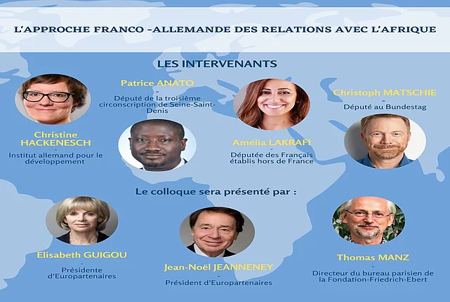 Un nouveau partenariat entre l'Afrique et l'Union européenne : Quel doit être le rôle de l'Allemagne et de la France ? 11/08/2020 23:00 to 01/01/1970 00:00 - 15h30 - 17h30, conférence en ligne Conférence en ligne, organisée en coopération avec Europartenaires. Avec la participation d'Elisabeth Guigou, Christine Hackenesch, Patrice Anato, Christoph Matschie et Amélia Lakrafi. Un compte-rendu de la conférence est disponible. Au mois de mars dernier, l’Union européenne présentait sa nouvelle stratégie de partenariat avec l’Afrique. Au regard des intérêts géostratégiques partagés par ces deux continents, ce programme innovant constitue la pièce maîtresse des prochaines activités de l’Union européenne. Couvrant des sujets d’intérêt commun tels que le climat et la croissance durable, il s’agira également de se concentrer sur des thématiques moins consensuelles comme la migration et la sécurité. Lors d’un sommet conjoint à venir, l’UE et l’Union Africaine discuteront de ce nouveau modèle de partenariat avec l’objectif de conclure un accord dans un esprit d’égalité et de coopération. Quel intérêt représente cette nouvelle stratégie pour l’Afrique ? Sa politique stratégique est-elle adaptée à ce nouveau modèle ? Des ajustements seront-ils nécessaires suite à la crise du coronavirus ? Comment ce programme est-il perçu par l’Allemagne et la France ? Et quel rôle ces deux pays européens peuvent-ils jouer ensemble pour promouvoir un nouveau partenariat ? C’est à ces questions que nous consacrerons nos échanges. 15h30 – 15h45 Mots d’accueil • Elisabeth Guigou, présidente d’Europartenaires • Thomas Manz, directeur du bureau parisien de la Fondation-Friedrich-Ebert 15h45 - 16h30 Table ronde 1 Une nouvelle stratégie de l'UE pour l'Afrique - pourquoi et sous quelle forme ? • Christine Hackenesch, Institut allemand pour le développement (DIE) • Patrice Anato, député de Seine Saint-Denis Débat animé par Jean-Noël Jeanneney, président d’Europartenaires 16h30 – 17h15 Table ronde 2 Quelle pourrait être la contribution de l'Allemagne et de la France à un futur partenariat ? • Christoph Matschie, député au Bundestag • Amélia Lakrafi, députée des Français établis hors de France Débat animé par Jean-Noël Jeanneney, président d’Europartenaires 17h15 – 17h30 Conclusion Elisabeth Guigou, présidente d’Europartenaires Accéder au compte-rendu